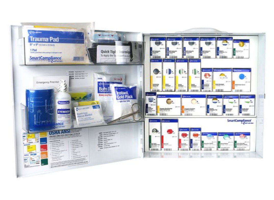SmartCompliance large metal 2021 ANSI B first aid cabinet with medications for general business delivers cost savings and a convenient replenishment system that keeps a business ANSI compliant.